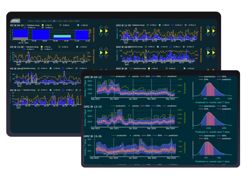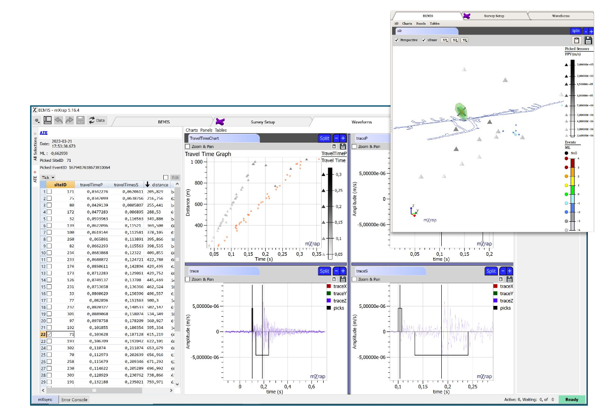 BEMIS’ software ecosystem brings together a range of specialized tools including general real-time seismic monitoring, cluster analysis, tomographic imaging, and more. It also includes production oriented and non-traditional use of seismic data, such as ore pass monitoring. This modular toolkit ensures that users can address both immediate safety concerns and long-term planning needs, with new updates and features added seamlessly over time.